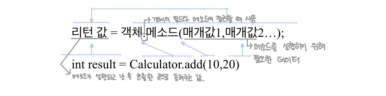 -메소드 : 객체의 동작에 해당하는 실행 블록. 객체 간의 데이터를 전달하는 수단이다. 외부(호출한 곳)으로부터 매개값을 받아 실행에 이요하고, 실행후 결과 값을 리턴할 수 있다.