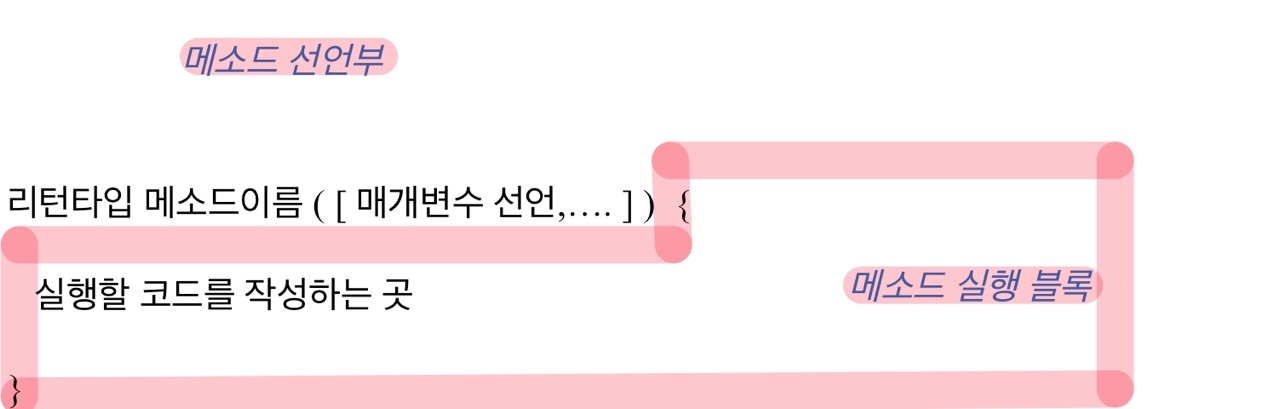 -매개변수 선언 : 메소드 실행할 때 필요한 데이터를 받기위한 변수 선언 - 메소드 실행 블록 : 실행할 코드를 작성