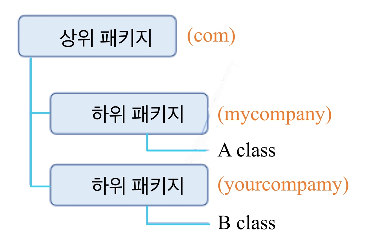- 패키지 : 프로젝트 개발 시 클래스를 체계적으로 관리하기 위해 패키지를 사용하며, 클래스와 클래스의 멤버를 사용범위에 맞게 접근 제한자를 활용해야한다. 패키지의 물리적인 형태는 파일 시스템의 폴더이고 패키지는 클래스의 일부분으로 클래스를 유일하게 만들어주는 식별자 역할을 한다. 클래스의 이름이 동일하더라도 패키지가 다르면 다른 클래스로 인식하며 클래스의 전체 이름은 패키지+클래스 이름이며 패키지의 상하위 구분은 .으로 한다.