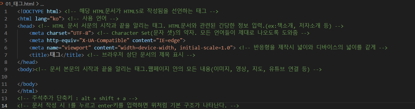 - HTML 태그 : 열린태그와 닫힌태그, 속성, 속성값으로 구분.