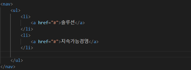 <nav> 태그 : 메뉴 버튼을 담는 공간. <nav> 태그 안에는 버튼을 만들 때 사용하는 <ul>, <li>, <a>태그를 입력할 수 있음.