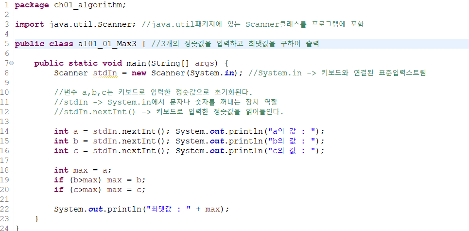 import java.util.Scanner; //java.util패키지에 있는 Scanner클래스를 프로그램에 포함 (클래스 선언 앞에 작성)