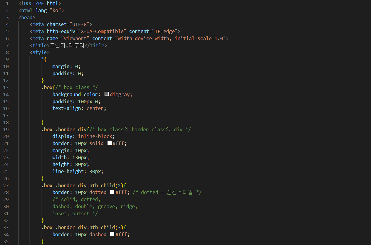 HTML, CSS/작업물 HTML, CSS 기초 (작업물) : 07_테두리, 그림자(border, box-shadow) - 07_테두리, 그림자(웹페이지) 테두리,그림자 07_테두리, 그림자(코드) 1~35 36~65 66~100 101~110 -border : 선의굵기 선타입 색상; 속성값 : solid, dotter, dashed, double, groove, ridge, inset, outset -box-shadow : x축 y축 blur(흐릿함정도) spread(그림자의크기) 색상; x축이 양수일 경우 오른쪽에, 음수일 경우 왼쪽에 그림자 생성 y축이 양수일 경우 아래쪽에, 음수일 경우 위쪽에 그림자 생성 inset은 그림자의 효과를 안쪽으로 적용 공유하기 게시글 관리 버피 코딩 'HTML, CSS > 작업물' 카테고리의 다른 글 HTML, CSS (작업물) : 09_배경이미지 (0) 2023.03.28 HTML, CSS (작업물) : 08_테두리, 그림자 콘텐츠 (0) 2023.03.23 HTML, CSS 기초 (작업물) : 06_리스트아이템, 웹폰트적용 (0) 2023.03.23 HTML, CSS 기초 (작업물) : 05_여백 (0) 2023.03.23 HTML, CSS 기초 (작업물) : 04_모서리곡선 콘텐츠 (0) 2023.03.21 Contents 당신이 좋아할만한 콘텐츠 HTML, CSS (작업물) : 09_배경이미지 2023.03.28 HTML, CSS (작업물) : 08_테두리, 그림자 콘텐츠 2023.03.23 HTML, CSS 기초 (작업물) : 06_리스트아이템, 웹폰트적용 2023.03.23 HTML, CSS 기초 (작업물) : 05_여백 2023.03.23 댓글 0 + 이전 댓글 더보기
