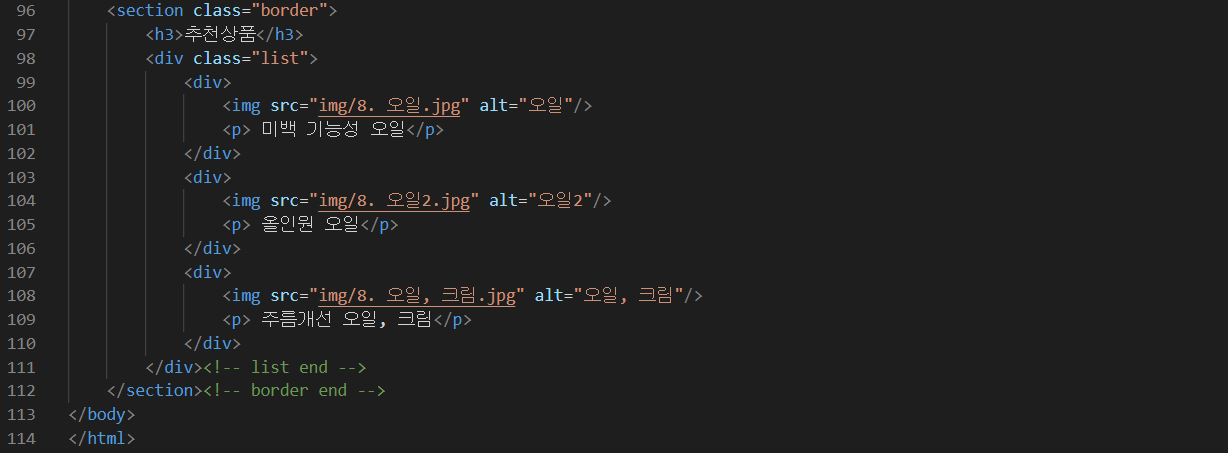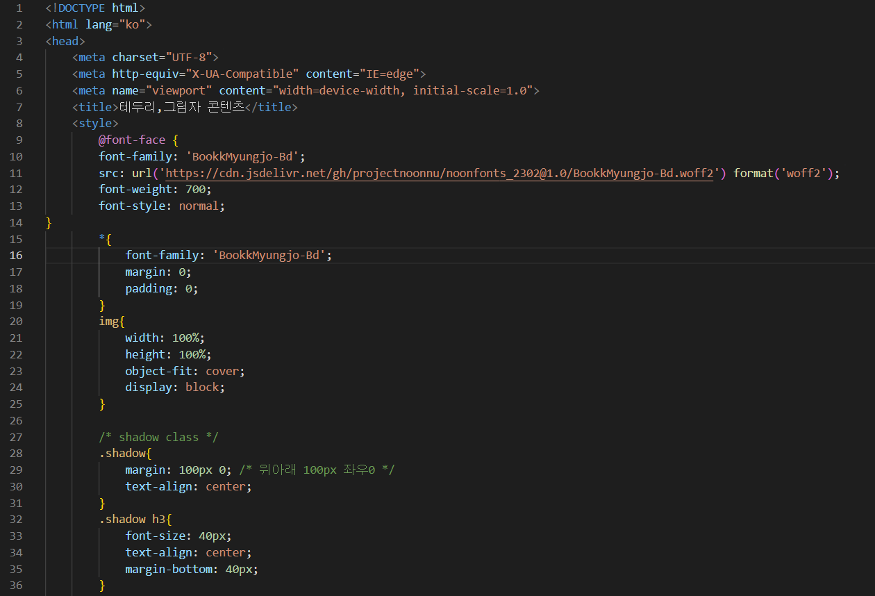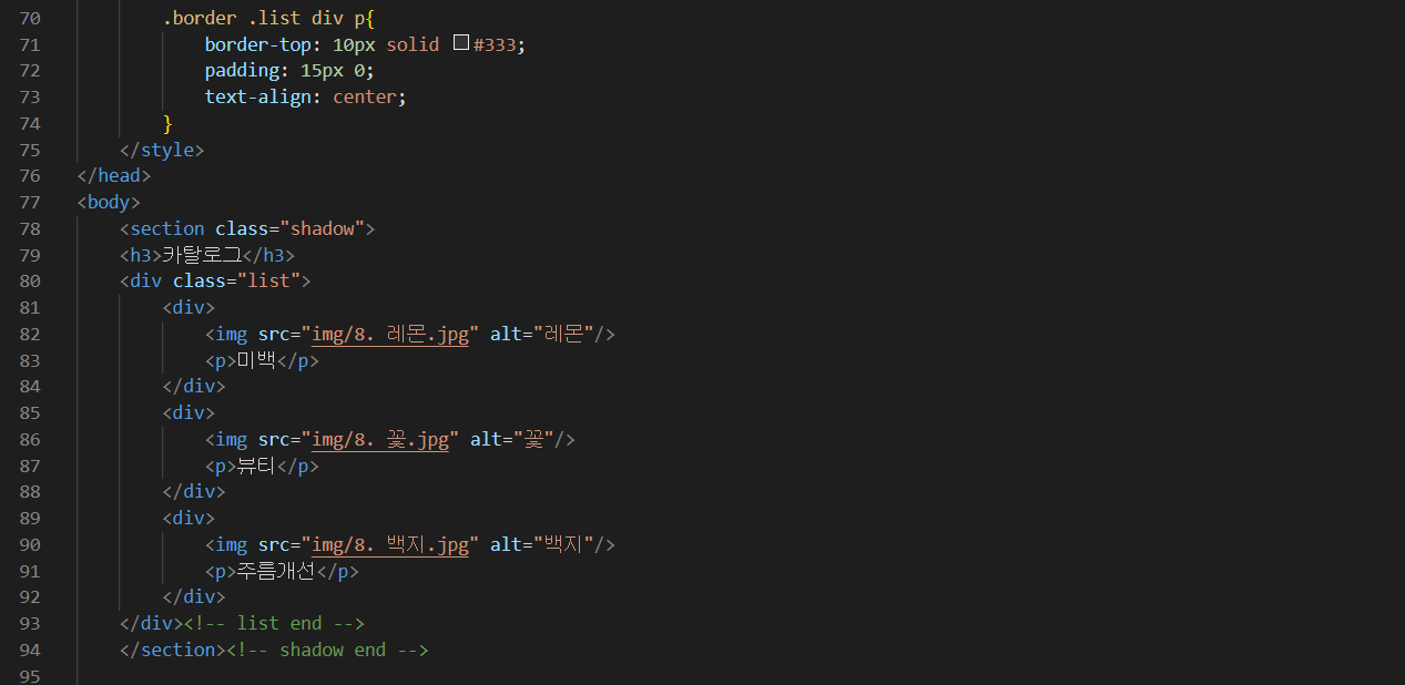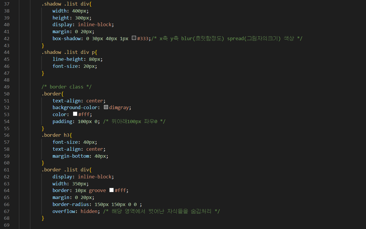 HTML, CSS/작업물 HTML, CSS (작업물) : 08_테두리, 그림자 콘텐츠 - 08_테두리, 그림자 콘텐츠(웹페이지) 테두리, 그림자 콘텐츠 08_테두리, 그림자 콘텐츠(코드) 1~36 37~69 70~95 96~114 -overflow: hidden : 내부 요소가 부모의 요소에 침법할 때 사용한다. 부모 요소에 적용 시 영역을 벗어나는 부분이 보이지 않게 된다. -overflow: scroll : 영역을 벗어나는 부분은 스크롤로 만든다. 공유하기 게시글 관리 버피 코딩 'HTML, CSS > 작업물' 카테고리의 다른 글 HTML, CSS (작업물) : 10_배경이미지포함레이아웃 (0) 2023.03.28 HTML, CSS (작업물) : 09_배경이미지 (0) 2023.03.28 HTML, CSS 기초 (작업물) : 07_테두리, 그림자(border, box-shadow) (0) 2023.03.23 HTML, CSS 기초 (작업물) : 06_리스트아이템, 웹폰트적용 (0) 2023.03.23 HTML, CSS 기초 (작업물) : 05_여백 (0) 2023.03.23 Contents 당신이 좋아할만한 콘텐츠 HTML, CSS (작업물) : 10_배경이미지포함레이아웃 2023.03.28 HTML, CSS (작업물) : 09_배경이미지 2023.03.28 HTML, CSS 기초 (작업물) : 07_테두리, 그림자(border, box-shadow) 2023.03.23 HTML, CSS 기초 (작업물) : 06_리스트아이템, 웹폰트적용 2023.03.23 댓글 0 + 이전 댓글 더보기