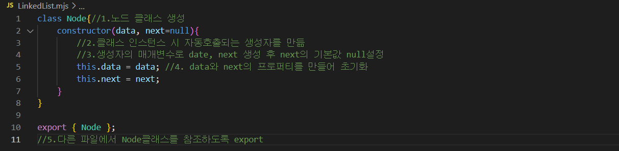 1. 노드 클래스 생성 2. 클래스를 인스턴스화 했을 떄 자동으로 호출되는 생성자를 만듦.(일반적으로 생성자에서 초기화를 함) 3. 생성자의 매개변수로 data와 next를 만들고 next는 기본값을 null로 설정해준다. (매개변수 data는 필수이지만, next는 입력하지 않는다면 null이 할당된다.) 4.자바스크립트에서 클래스 내의 변수를 프로퍼티라고 함. 생성자 내에서 data와 next 프로퍼티(변수)를 만들어 매개변수 data와 next로 초기화 5. 다른 자바스크립트 파일에서 Node클래스를 참조할 수 있도록 export