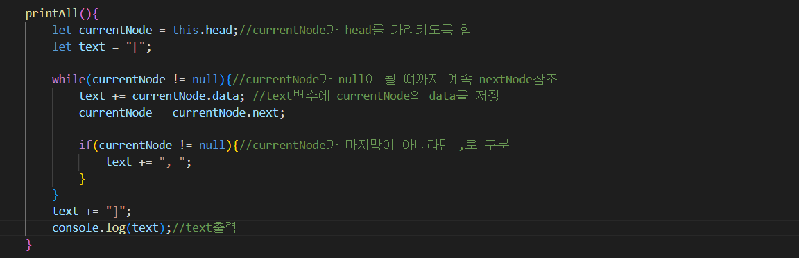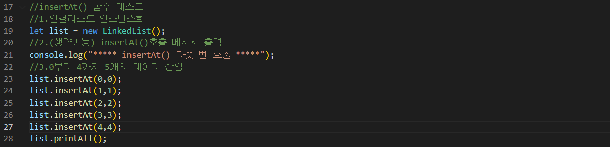 연결리스트 insertAt()함수 테스트 : 연결리스트 인스턴스화 -> 가독성을 위해 메시지 출력 -> 0부터 4까지 5개의 데이터 삽입 -> 삽입되었는지 확인을 위해 printAll함수 구현