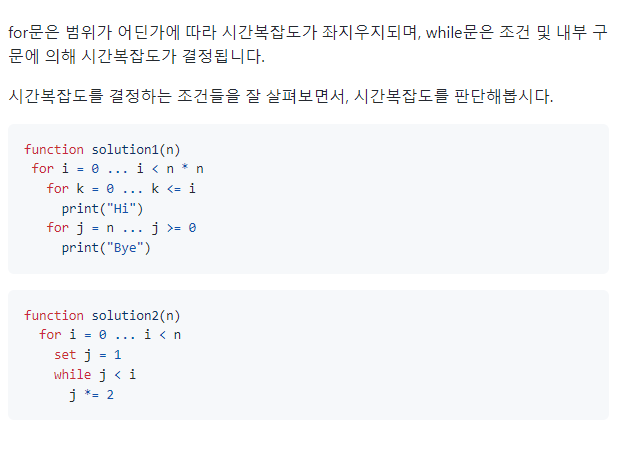 코딩테스트 [코드트리 조별과제] - 조금 복잡한 시간복잡도 - https://www.codetree.ai/missions/6/problems/time-complexity-3?&utm_source=clipboard&utm_medium=text 코드트리 | 코딩테스트 준비를 위한 알고리즘 정석 국가대표가 만든 코딩 공부의 가이드북 코딩 왕초보부터 꿈의 직장 코테 합격까지, 국가대표가 엄선한 커리큘럼으로 준비해보세요. www.codetree.ai 문제 풀이과정 첫번째 문제 k for문 -> 내부구문은 시간복잡도가 O(1), 0부터 i까지 i+1번 반복되기 때문에 시간복잡도가 O(i). 이떄 i는 최댓값이 n^2이므로 시간복잡도는 O(N^2) j for문 -> 내부구문은 시간복잡도가 O(1), j가 0부터 n까지 n+1번 반복되기 때문에 시간복잡도가 O(N) 바깥 for문 -> n^2만큼 반복. 따라서 O(N^2 * N^2) + O(N^2 * N) 이므로 O(n*4) 두번째 문제 while문에서 i가 1일때 반복횟수는 0, i가 2일때 반복횟수는 1, i가 4일때 반복횟수는 2, i가 8일때 반복횟수는 3.... i가 2배늘어날때마다 while문의 반복횟수가 1씩 늘어남 i에 대해 log i 반복이 필요 -> while문의 시간복잡도는 O(log i) -> O(log N) while문을 for문에서 N번 반복 따라서 O(log N * N) = O(N log N) 답 O(n*4), O(N log N) 공유하기 게시글 관리 버피 코딩 '코딩테스트' 카테고리의 다른 글 [코드트리 조별과제] 거품 정렬 구현(Bubble Sort) (0) 2024.07.31 [코드트리 조별과제] 정수 명령 처리 5 (0) 2024.07.30 [코드트리 조별과제] - for와 while (5) 2024.07.23 [코드트리 조별과제] - 대입과 조건문의 시간복잡도 (4) 2024.07.23 [코드트리 조별과제] - 펜트하우스 (1) 2024.07.22 Contents 당신이 좋아할만한 콘텐츠 [코드트리 조별과제] 거품 정렬 구현(Bubble Sort) 2024.07.31 [코드트리 조별과제] 정수 명령 처리 5 2024.07.30 [코드트리 조별과제] - for와 while 2024.07.23 [코드트리 조별과제] - 대입과 조건문의 시간복잡도 2024.07.23 댓글 0 + 이전 댓글 더보기